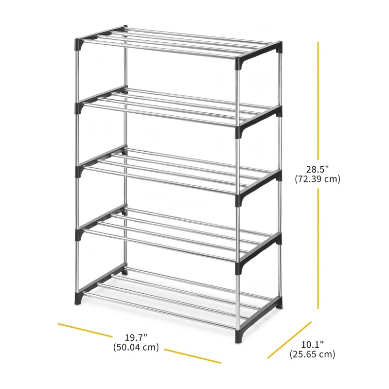 The 10 Pair 5 Tier Closet Shoe Rack in Silver by Whitmor is a stylish and functional addition to any home. Made of durable metal, this shoe rack stands at 28.50 inches tall with 5 shelves providing space for up to 10 pairs of shoes. The free-standing design allows for easy placement in any closet or hallway, and the assembly is required for optimal functionality. With dimensions of 10.10 x 19.70 x 28.50 inches, this shoe rack is both practical and lightweight for easy handling.