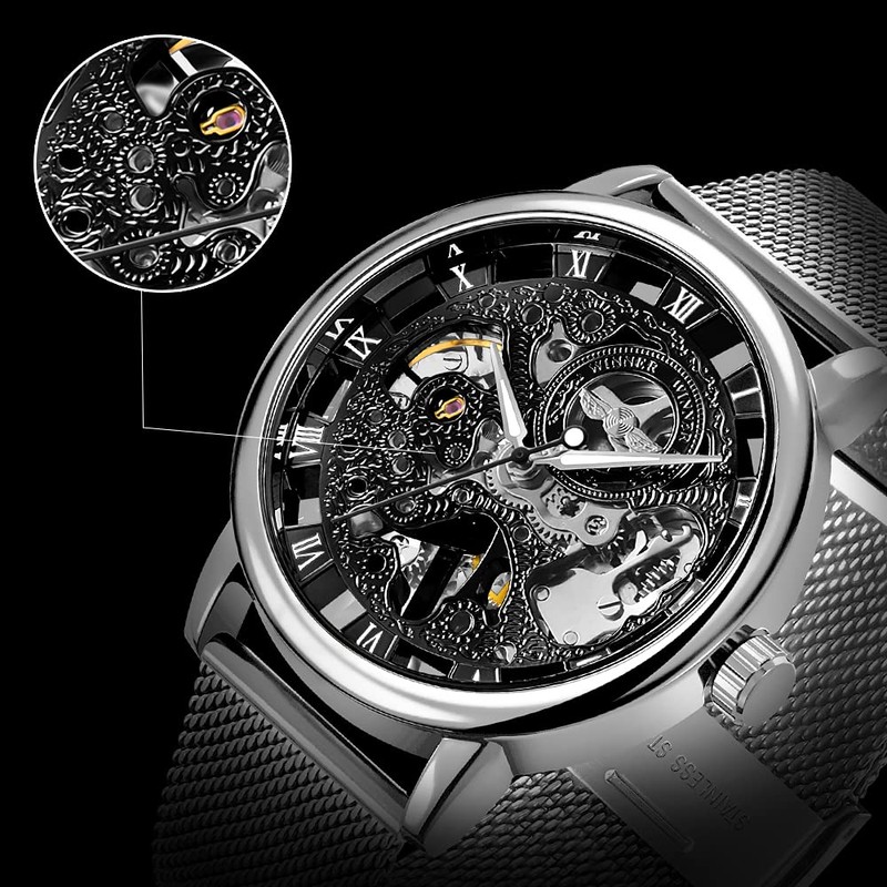 Whodoit Men's Watch Hand-Wind Mechanical Mesh Luminous Silver Black Waterproof Watch,Skeleton Mechanical Roman Numeral Mesh Strap Watch for Men