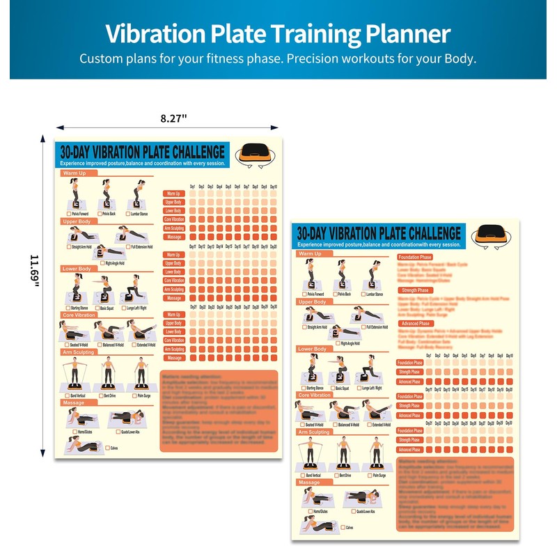 - Universal Training Solution: This kit includes 6 vibrant exercise posters and 2 planners (30-Day Progression Guide + Freestyle Tracker), compatible with all vibration plate machines to enhance muscle toning, balance, and energy.