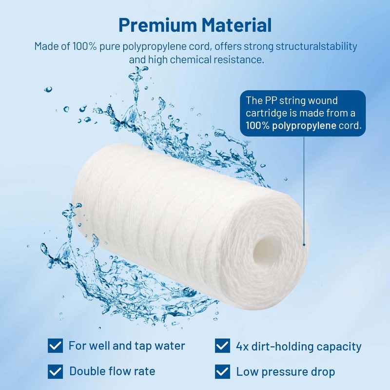 • SWC10B05 PP string wound sediment filter reduces sediment, dirt, scale, and rust down to 5 microns from city and well water applications. Used as a prefilter for whole house water filtration systems and various commercial and industrial applications