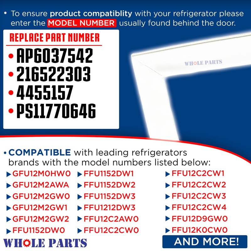 - 🔧Whole Parts Refrigerator Freezer Door Gasket (White Color) Part# 5304507202. Approximate Size is 49.61” x 27.09”. This Part Replaces AP6037542, 216522303, 4455157, PS11770646.