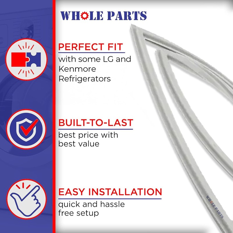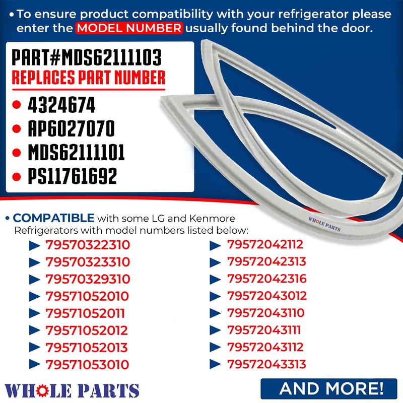 - 🔧Whole Parts Refrigerator Ice Bank Door Seal Gasket, Part# MDS62111103 - Replacement & Compatible with Some LG and Kenmore Refrigerators. Approximate Size is 17.3" x 12.8". This Part Replaces AP6027070, MDS62111101, 4324674, PS11761692.