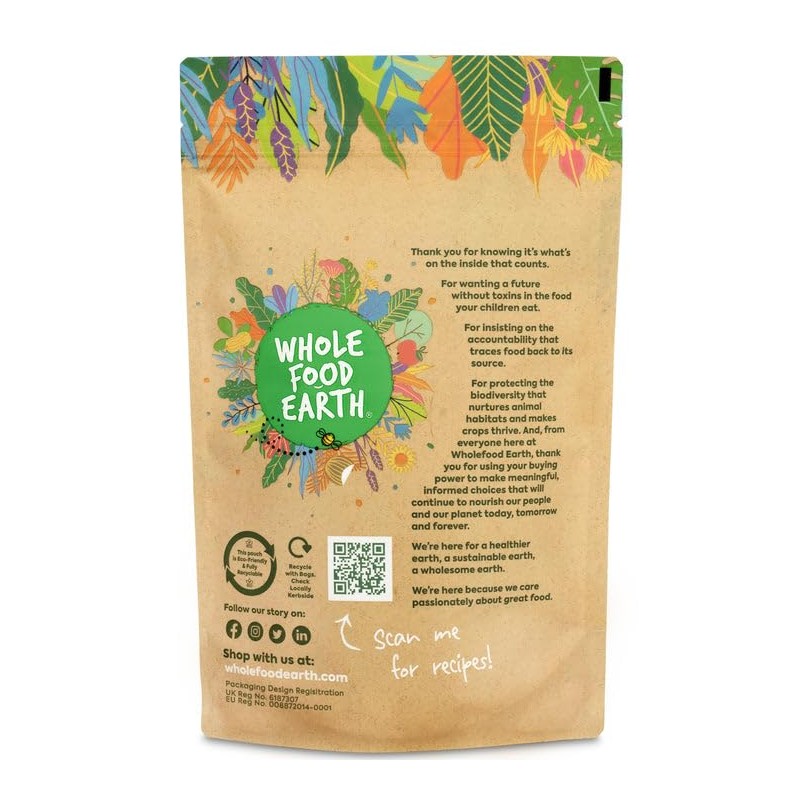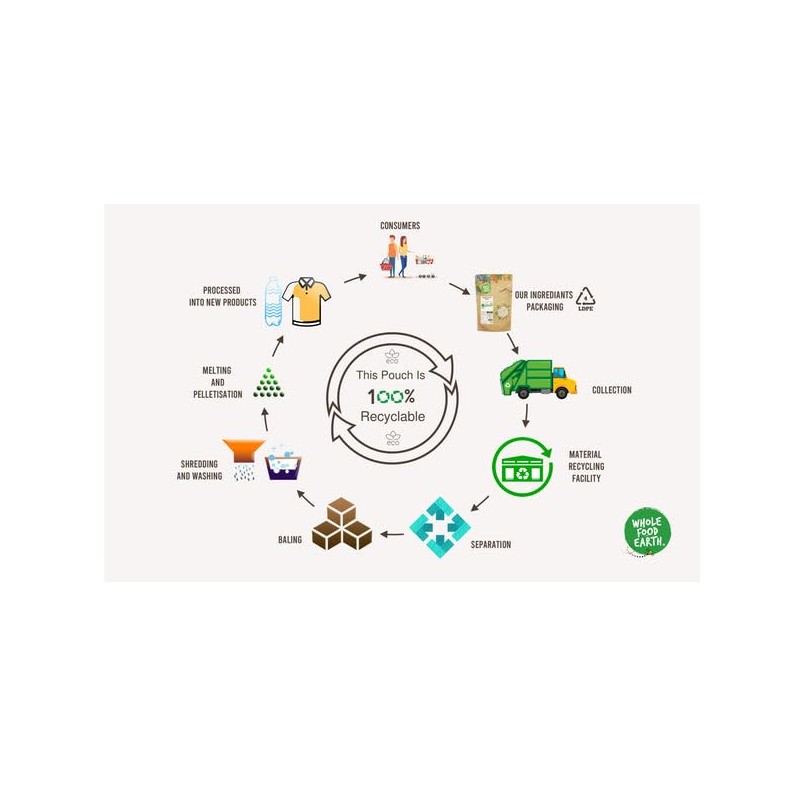 - Just The Good Stuff / Fully Recyclable Packaging: Wholefood Earth is committed to sustainable practices, using fully recyclable packaging. This process involves efficient collection, separation, baling, shredding, and thorough washing. Materials are then melted and pelletized before being transformed into new packaging. This comprehensive approach minimises waste and contributes to a healthier environment.