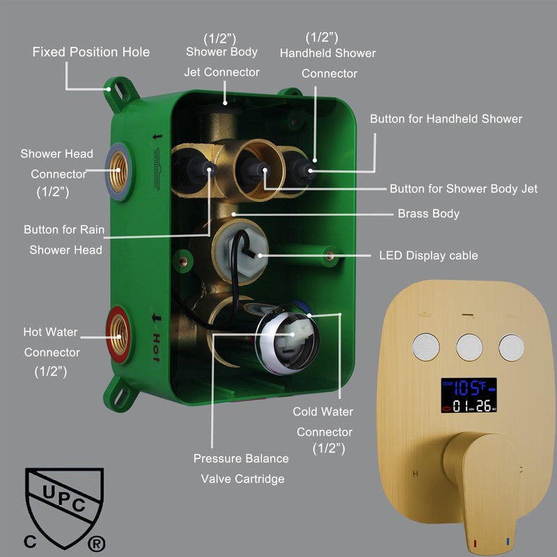 - 【Innovative LED Display】Our shower diverter valve features a built-in LED display, NO NEED batteries. The display shows real-time temperature (in Fahrenheit) and action time, allowing you to have complete control over your shower experience and ensuring the perfect water temperature every time.