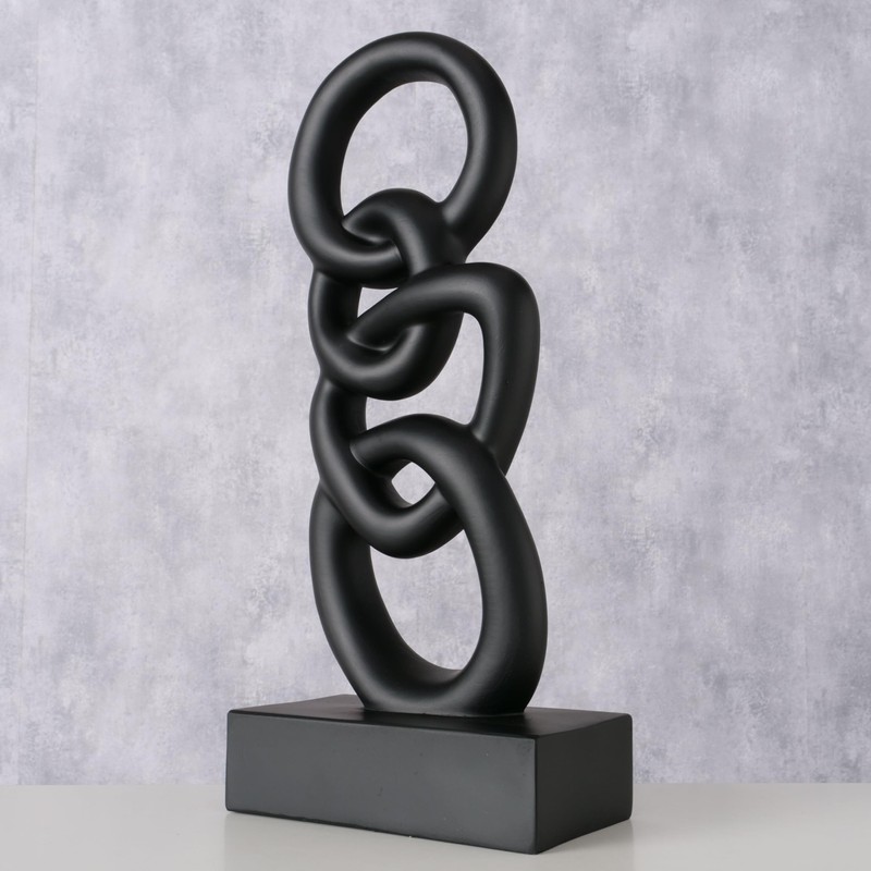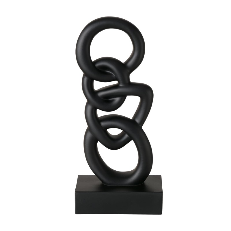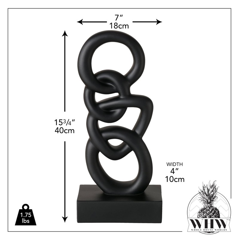 WHW Whole House Worlds Abstract Linked & Stacked Loops Art Sculpture, Black, Matte Finish, Free Standing, Mounted, Rectangular Gallery Base, Hand Cast Resin, 15,75 Inches Tall
