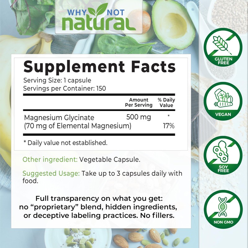 Why Not Natural Magnesium Glycinate Capsules Supplement - Vegan, 100% Pure, N...