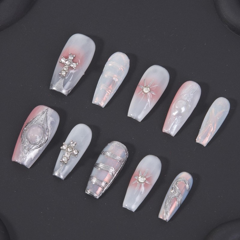 WhyNotNailIt Pastel Dreamscape Handmade Press-On Nails with Crystal Cross, 10-Pc Set with Jelly Gel | Ethereal False Nails for Daily Enchantment