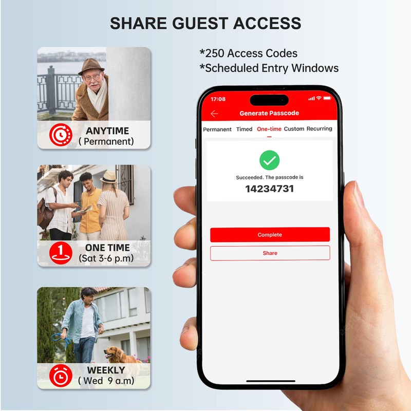 - 【Grant Flexible Temporary Access】Offer temporary access codes for dog walkers, guests, housekeepers, or staff. Assign up to 250 passcodes and revoke them anytime. No more worrying about extra keys floating around, you're in control.