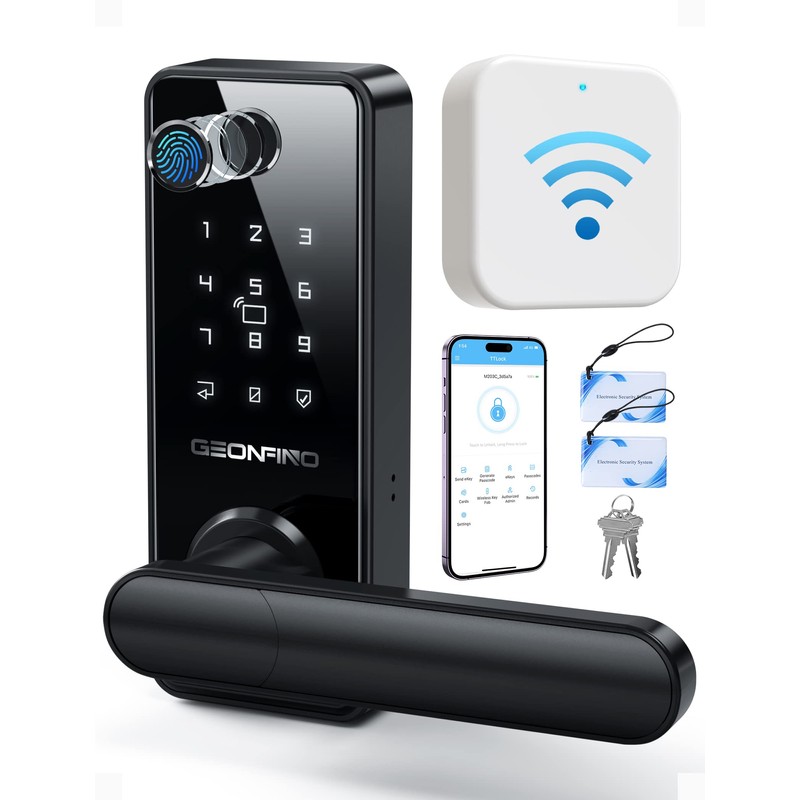 GEONFINO Smart Door Lock with Handle, 6-in-1 Fingerprint Keyless Entry Door Lock, Electronic Digital Deadbolt with Handle, Smart Lock Set Compatible with Alexa (Gateway Included)