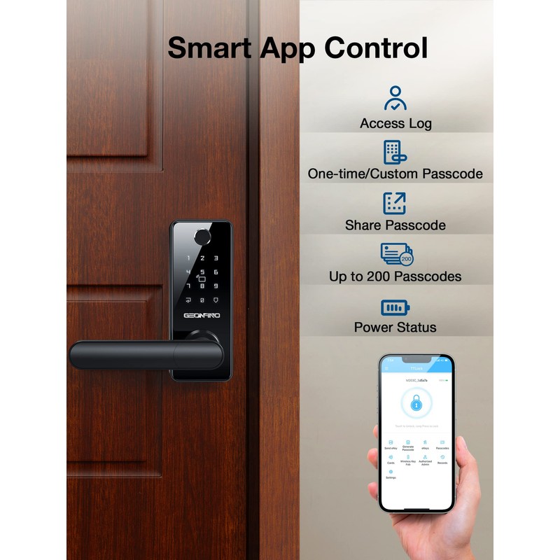 - [6- in-1 Smart Keyless Entry Door Lock] The GEONFINO keyless entry door lock gives you 6 ways to unlock doors: fingerprint, APP control, IC card, passcode, physical key, and G2 Gateway. You can rest thanks to the possibility of generating up to 200 passcodes with different validity periods and sending them to your family, friends, or dog walker. Forget about having to rush home to open the door. The smart lock for front door can be unlocked in 0.5s, versatile for homes, offices, and hotels.