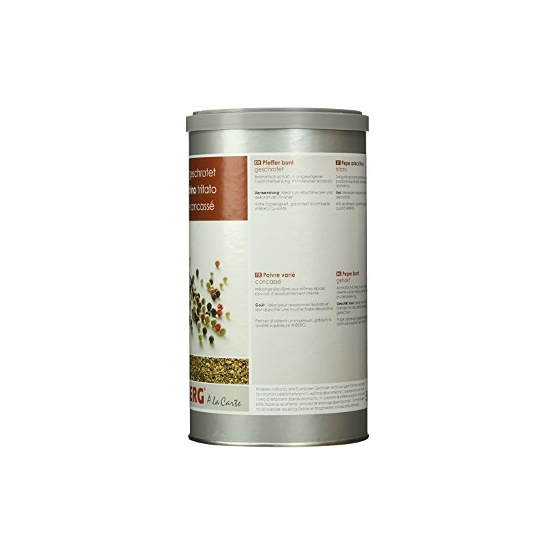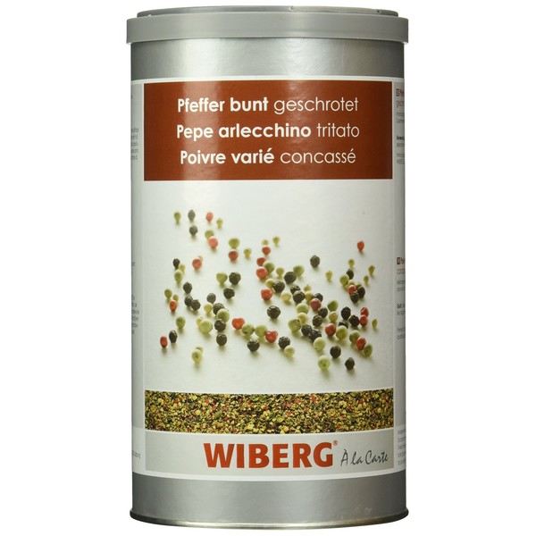 WIBERG - Pepper colourful, crushed - 580g. Ingredients: pepper green, black, white, pink crushed Ingredients: pepper green, black, white, pink. Store in a cool, dry and protected from light. Features: No nutritional values need to be specified.