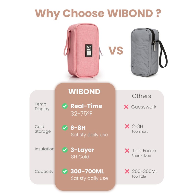 - Meet the WIBOND Breastmilk Cooler Bag—the ultimate on-the-go solution for breastfeeding moms who demand freshness, convenience, and peace of mind. Designed with real-time temperature display, this portable cooler ensures your breast milk stays at safe temperatures from home to daycare, work, or travel. More Than Just a Cooler: Use it for snacks, juice boxes, cosmetics, or medications—this versatile cooler adapts to your busy life.
