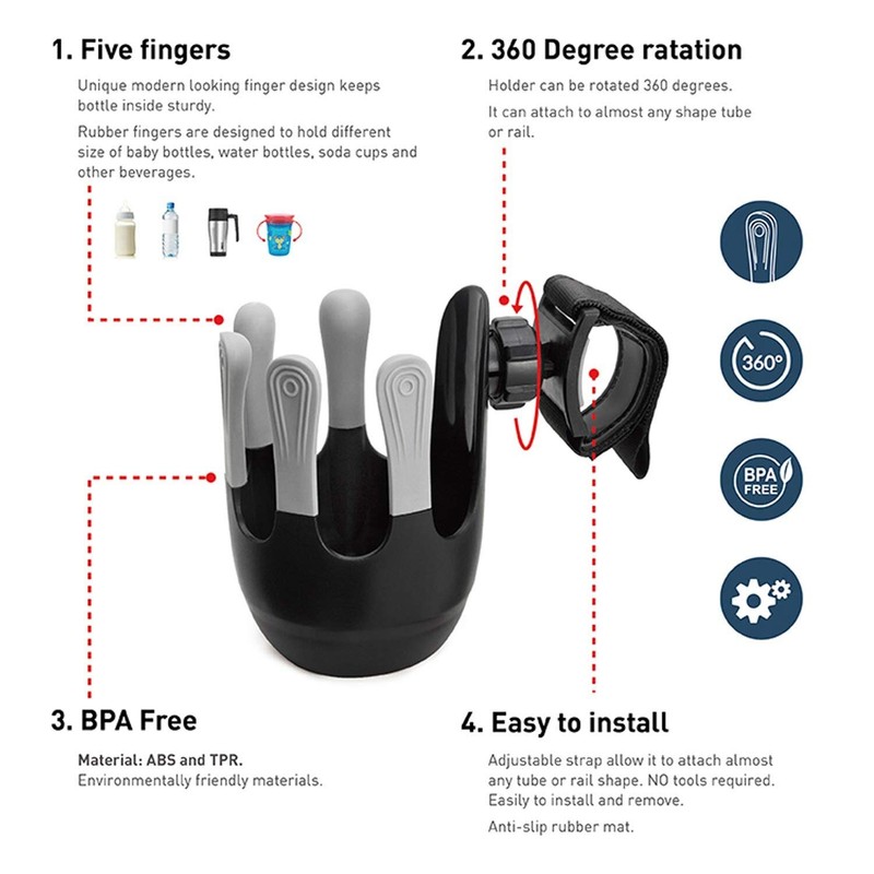 • Unique: modern design with five rubber fingers that firmly encompass the drinking vessel. Pull out the fingers and remove the Velcro to clean the holder in the dishwasher