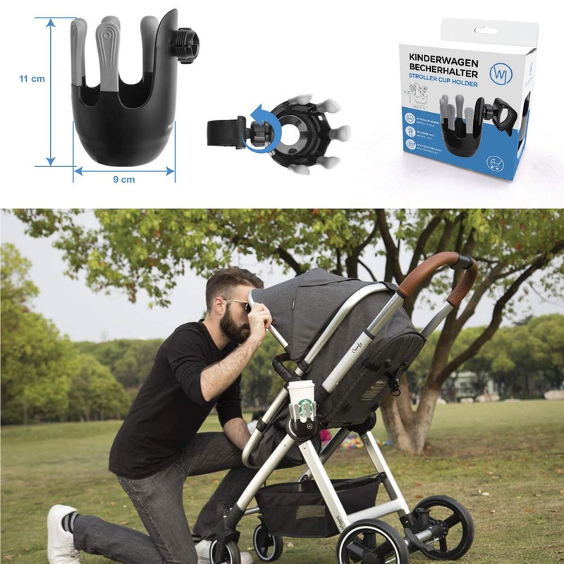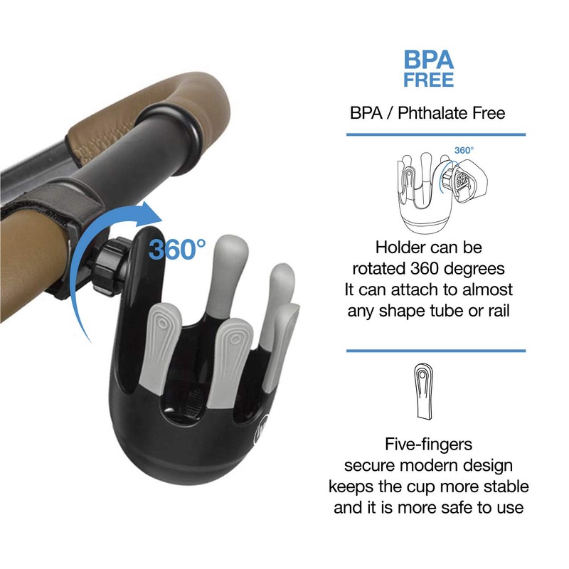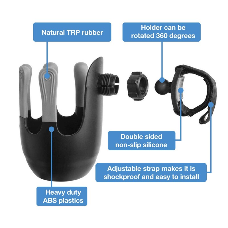 • VERSATILE: bottle holder with adjustable Velcro strap and 360 degree joint for a variety of uses such as stroller, wheelchair, walker, hospital bed or shopping cart