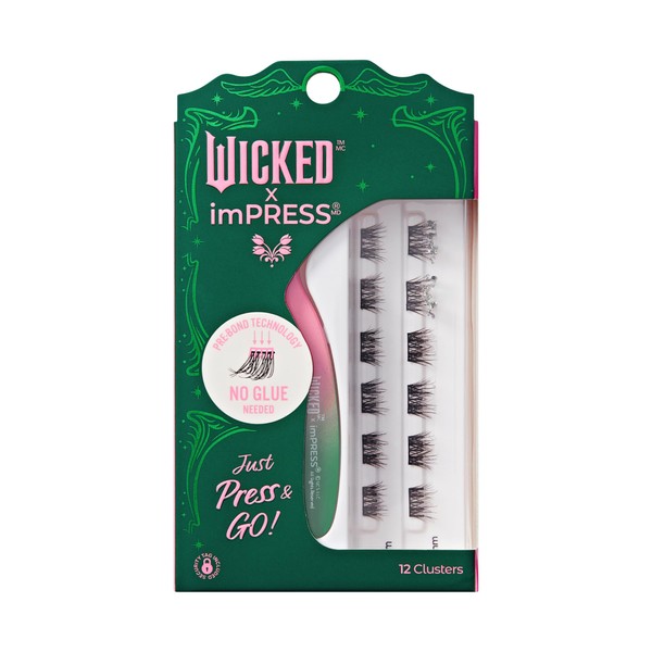 WICKED X imPRESS Press On Self Adhesive Eyelashes, ‘Some of Us Are Different’, 12 Lash Clusters, 8mm-10mm, Natural Volume, Silver Glitter, Pink & Green Mini Applicator
