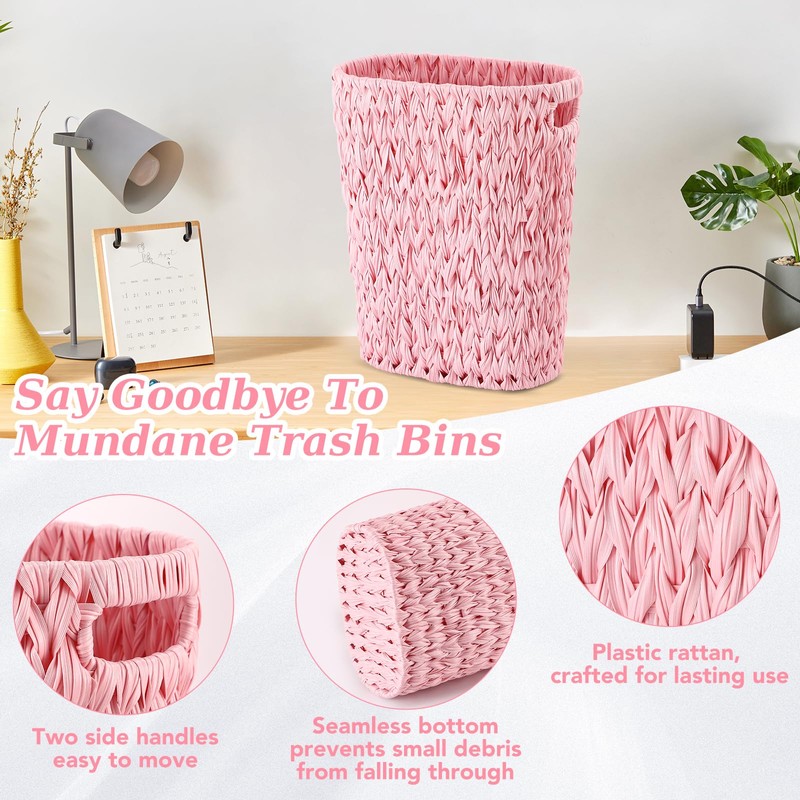 Wicker Trash Can & Square Tissue Box, Handwoven Waterproof Waste Basket with Handles, Wicker Home Set for Bedroom, Bathroom, Kitchen, Office, Balcony, Pink