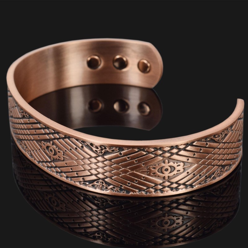 - Experience the Power: Ditch the pills and discover the advantages of our copper magnetic bracelet today! This stylish copper cuff features 6 strong neodymium magnets, each rated at 3,500 gauss and specifically designed to effectively target wrist aches and discomfort.