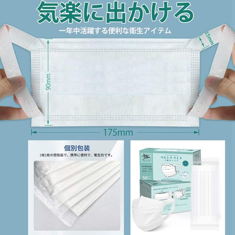 Wide Ear Straps, Non-woven Mask, Won't Hurt Your Ears, Individually Packaged, 50 Pieces, Adult (Regular, Three-Layer Construction, Pleated Type, Wide Ear Straps, Disposable Brodio Mask, Breathable