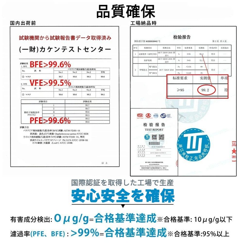 - Domestic inspection: Uses a high-density filter with a three-layered structure. The filter performance is tested by Japanese laboratories and has been certified to be a high quality non-woven mask that exceeds all passing standards for peace of mind
