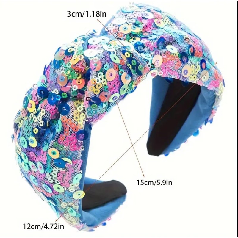 - DESIGN: Luxurious wide headband featuring intricate multi-colored sequin embellishments in rainbow hues across a knotted top design