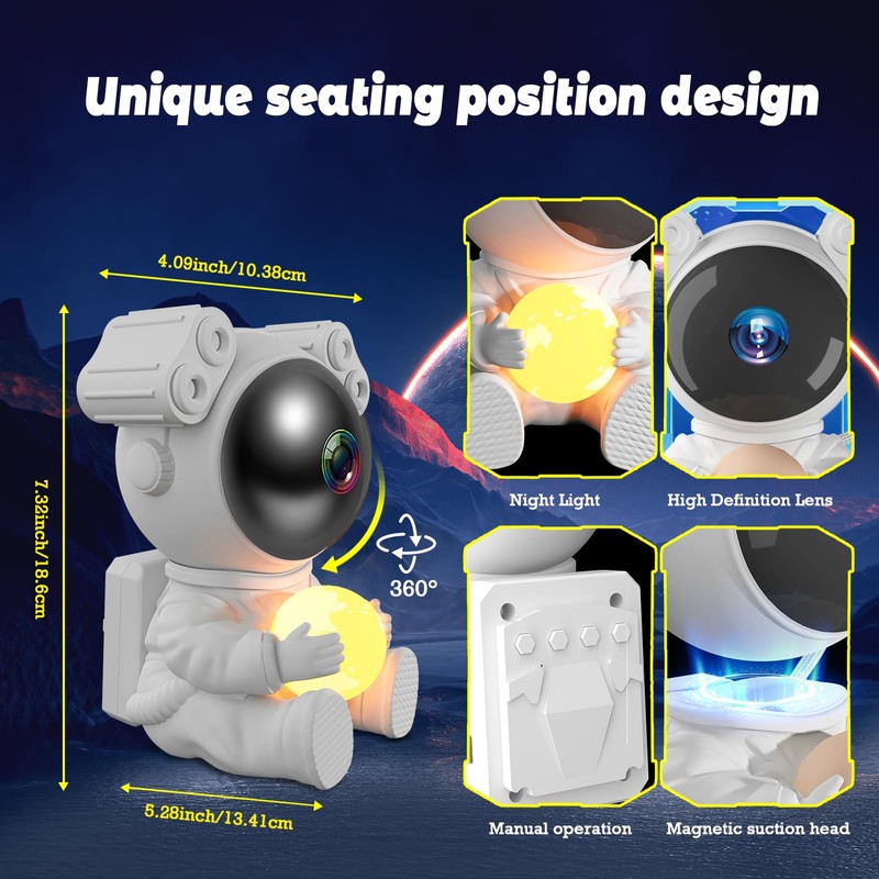 - Unique and flexible projection design - The design of this spaceman projector is similar to an astronaut, its head is magnetically attached and can be rotated 360° to adjust the projection angle of the nebula, in addition, the moon base is removable and the arm can be placed in different poses, which makes it not only a star projector, but also a novel and adorably beautiful decorative ornament.