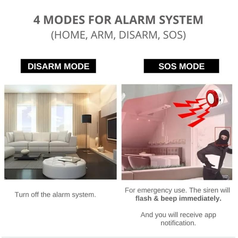 • MULTIFUNCITIONAL APP AND REMOTE CONTROL: You can achieve various functions on the Tuya app: disarm the alarm; Set the alarm duration; Set the alarm volume; timing; Delete or add alarm buttons. You can also arm or disarm via remote control.