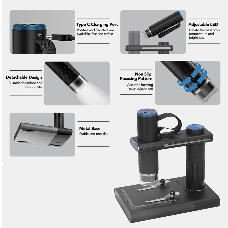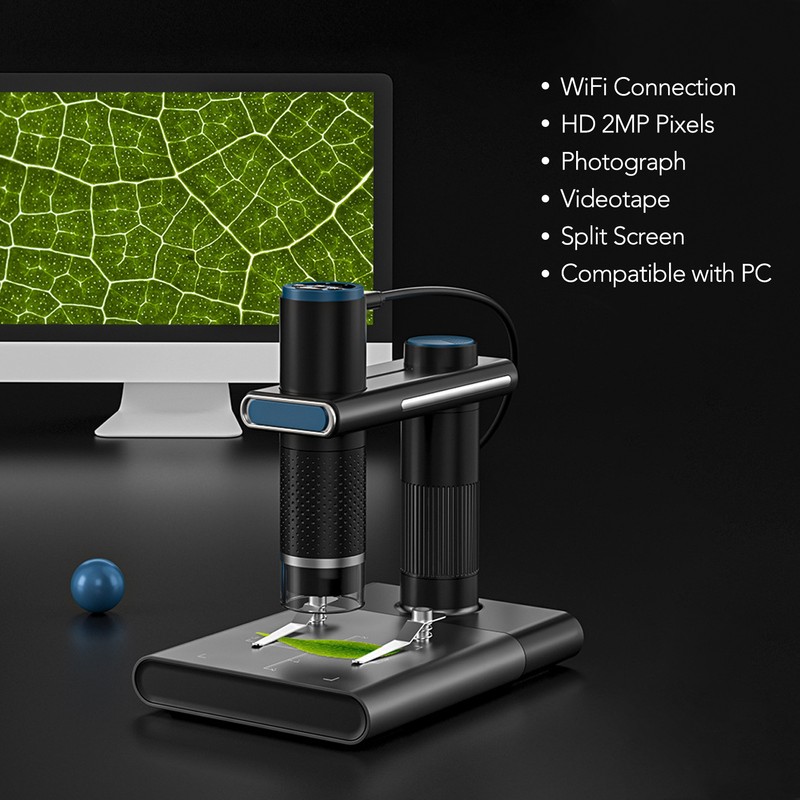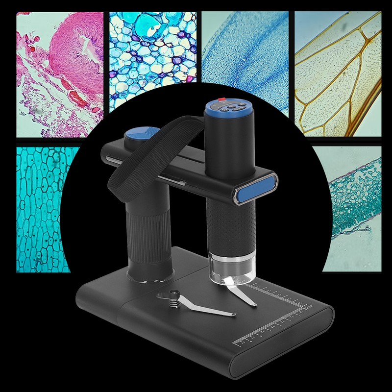 1、PRODUCT FEATURES: Portable WiFi microscope, with 2MP high definition pixels, 50‑1000X zoom factor, has high image and video resolution. 2、WIFI CONNECTION: Adopts WiFi connection mode, excellent chip, the long distance transmission up to 10 meters, uninterrupted and not stuck. 3、WIDE APPLICATION: The WiFi microscope can be used for testing textiles, printing, PCB, instruments, skin, etc., which is convenient and practical. 4、WITH BATTERY: The microscope has built in 800mah lithium battery, with USB cable, which is convenient for use anytime and anywhere. 5、STABLE STAND: The microscope is equipped with a stable stand, which has clear scales to ensure accurate and reliable measurement.