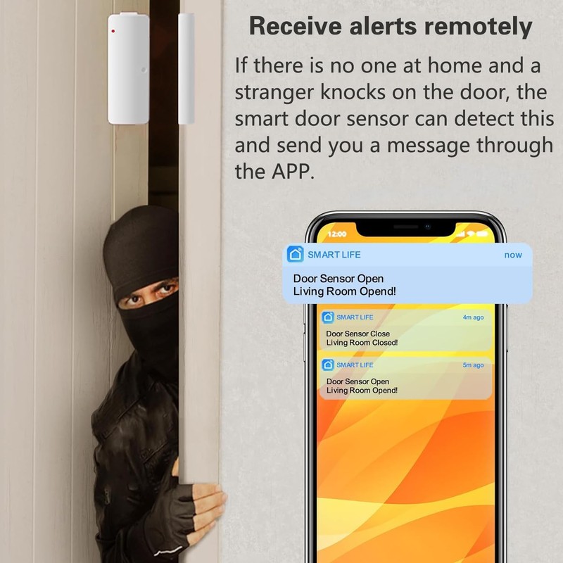 - ⭐【Smart Door Sensor】: This door alarm is a great security addition to any contact structure: front door, window, nursery, garage door, skylight, safe, etc. Observe the safety barrier at the top of the stairs. You will receive real-time notifications on your phone when doors and windows are opened or closed. No hub is required.
