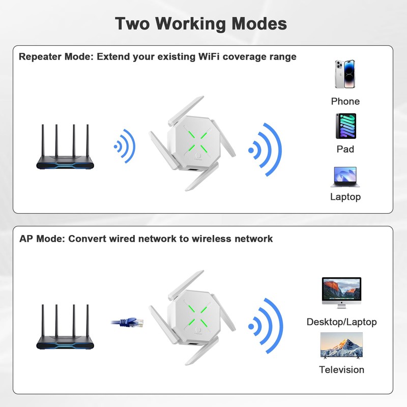 • ‌Ultra-Wide Coverage & Blazing Speed‌: WiFi Extender has Dual AP Amplifiers & AC1200Mbps‌ ensure stable signals across ‌6000 sq.ft‌, eliminating dead zones for seamless streaming, gaming, and video calls