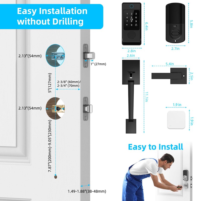 - 【Easy to Install】No extra hole drill for smart deadbolt. Door handle also has an adjustable screw hole to fix. Install in minutes with a detailed manual and installation video. Design for US Standard left and right hand doors that thickness is 1.49-1.89 inches(38-48mm); Backset: 2-3/8″(60mm) or 2-3/4″(70mm).