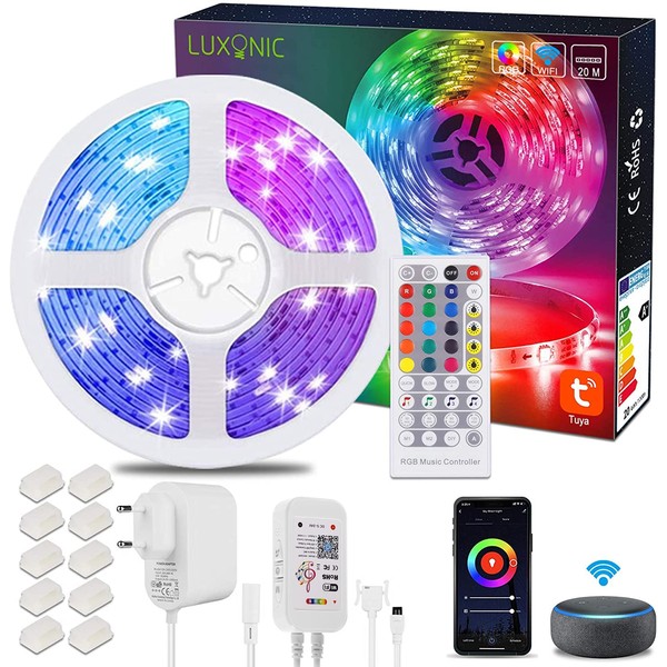 WiFi LED Strip 20 m / 65.6 ft, LUXONIC Smart RGB Stripes Colour Changing, App Controlled Music Synchronization, Works with Google Assistant, Alexa, Ultra Long LED Light for Room Home Decoration