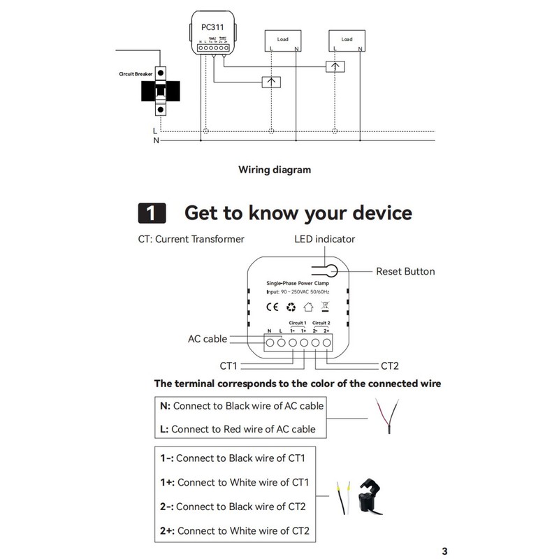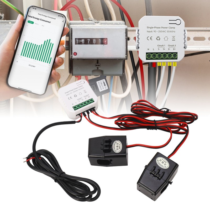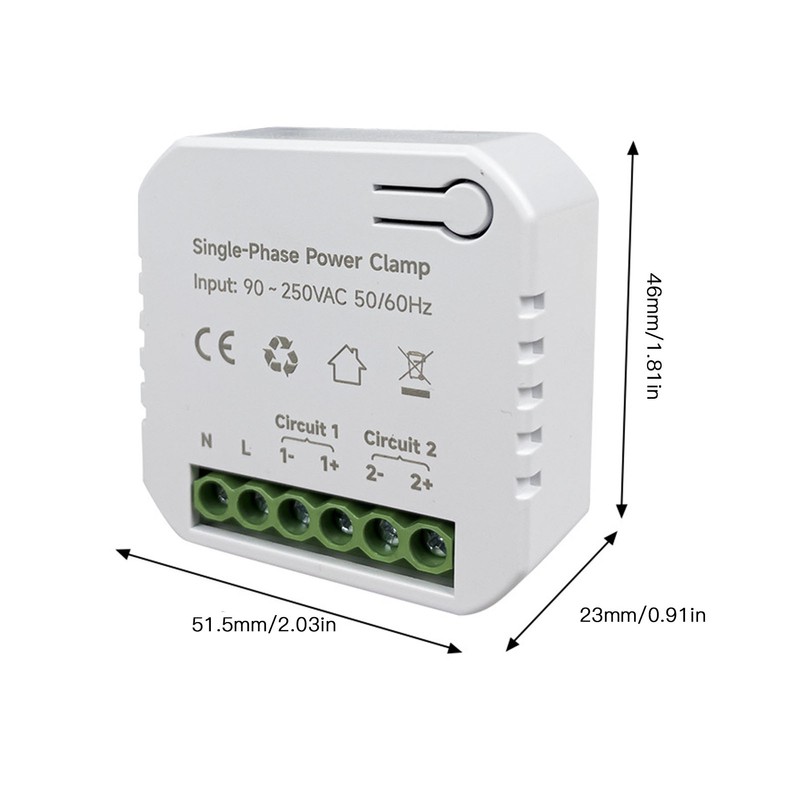 1、Multifunctional: This smart home energy meter features real time monitoring and measurement of energy usage, voltage, current, power factor, active power and frequency. 2、Safe And Reliable: This smart home energy meter has an overload protection function, which can effectively avoid electrical malfunction and safety problems caused by excessive energy consumption of electrical appliances. 3、Easy To Operate: This smart home energy meter is very easy to operate, without changing the wire connection, you only need to put the wires into the clips to take measurements. 4、Monitor Bidirectional Energy Consumption: This smart home energy meter can monitor bidirectional energy consumption, if the user has a solar photovoltaic system at home, after installing it according to our wiring diagram, the device can monitor the power generated by the solar photovoltaic system and the energy consumed by the city power grid. 5、2 CT Clamp Sensors: This smart home power meter comes with 2 120A current transformer CT clamp sensors for measuring current.