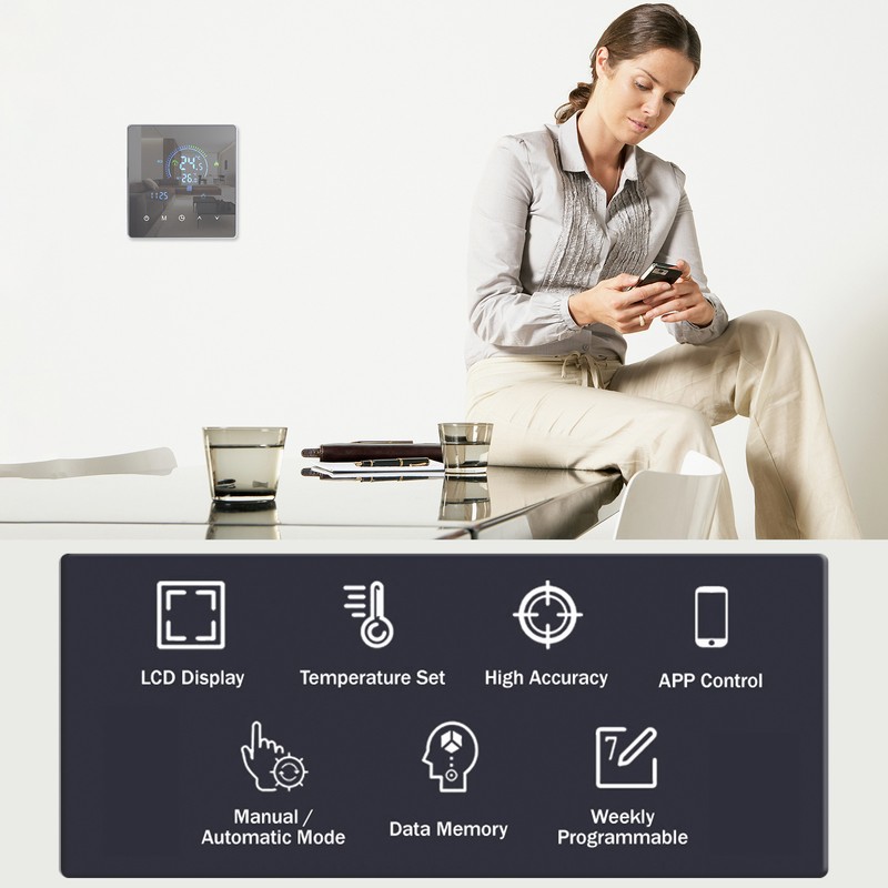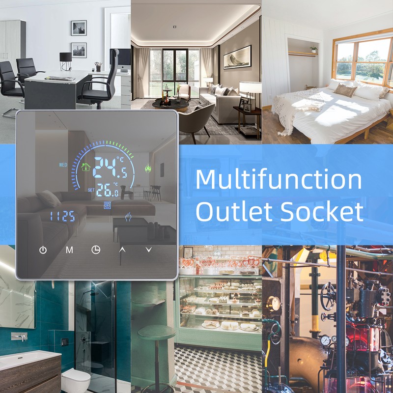 1、【 Intelligent Thermostat】 Adopts ultra-thin wall-mounted body and touch operation buttons design, easy to install and simple to use. Suitable for water heating system, such as water-carrying underfloor heating, water valves and hot water systems etc. 2、【Weekly Programmable】Can preset adjustment of 5+2 mode in a week, programmable setting of 6 time periods a day, energy saving and less cost. It is pleasantly warm when you are at home. 3、【Manual&Auto Mode】Free to choose manual mode or auto mode for different purposes. 4、【Touch Button&LCD Screen】 Touchscreen buttons that are practical and beautiful, made of ABS and tempered , scratch-resistant. Large LCD screen display with backlight, easy to read. 5、【Advanced Operation】Support antifreeze function and child lock function. Also, available to set temperature limitation and upper temperature limitation. And convertible between Celsius and Fahrenheit temperature units.