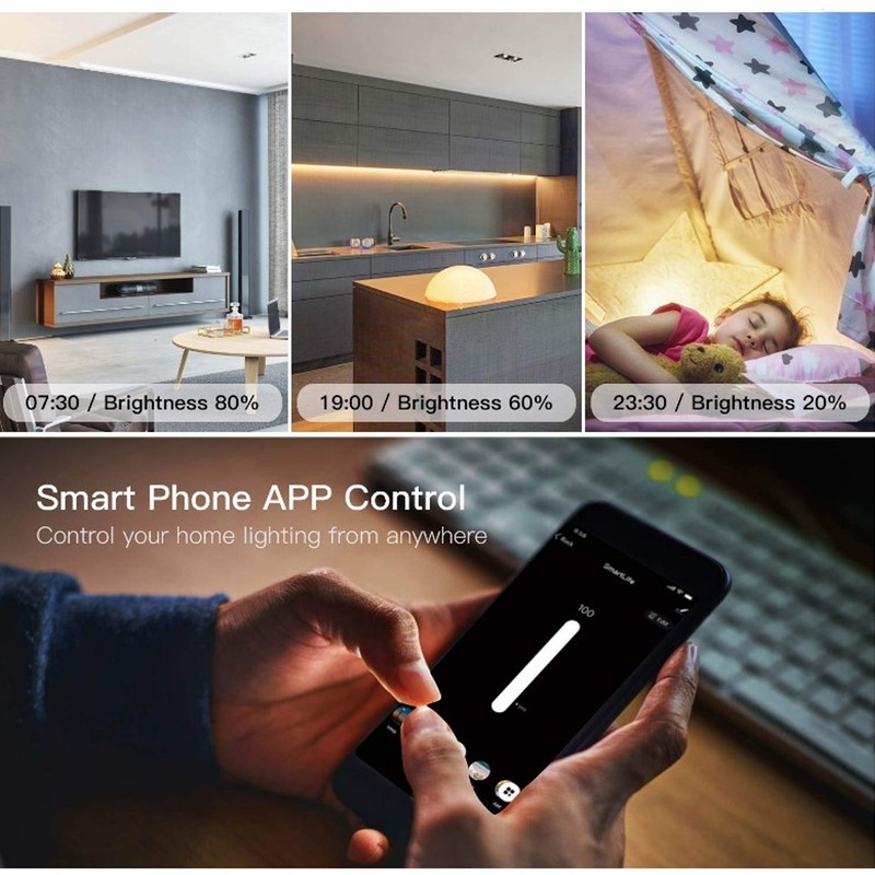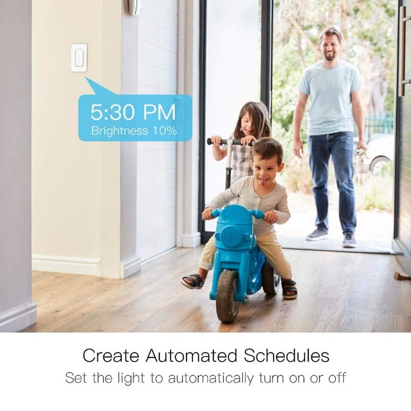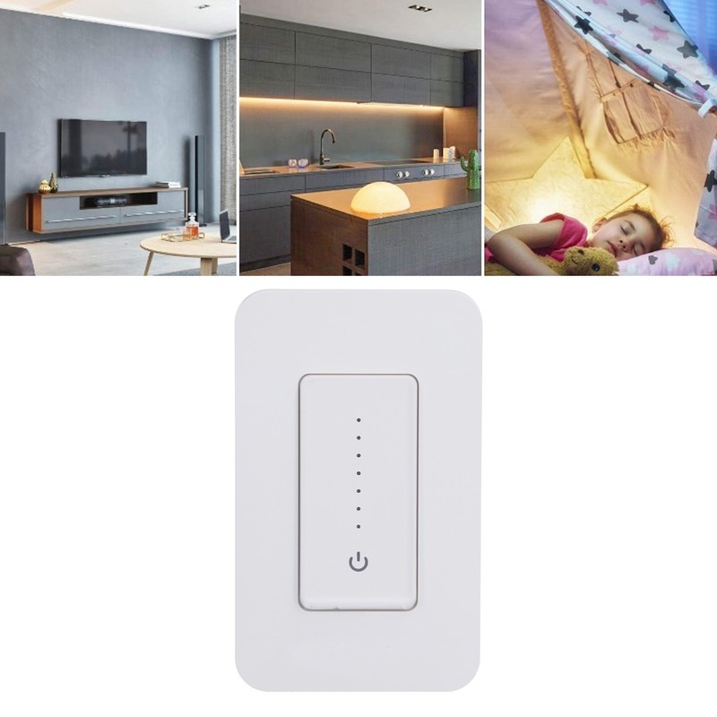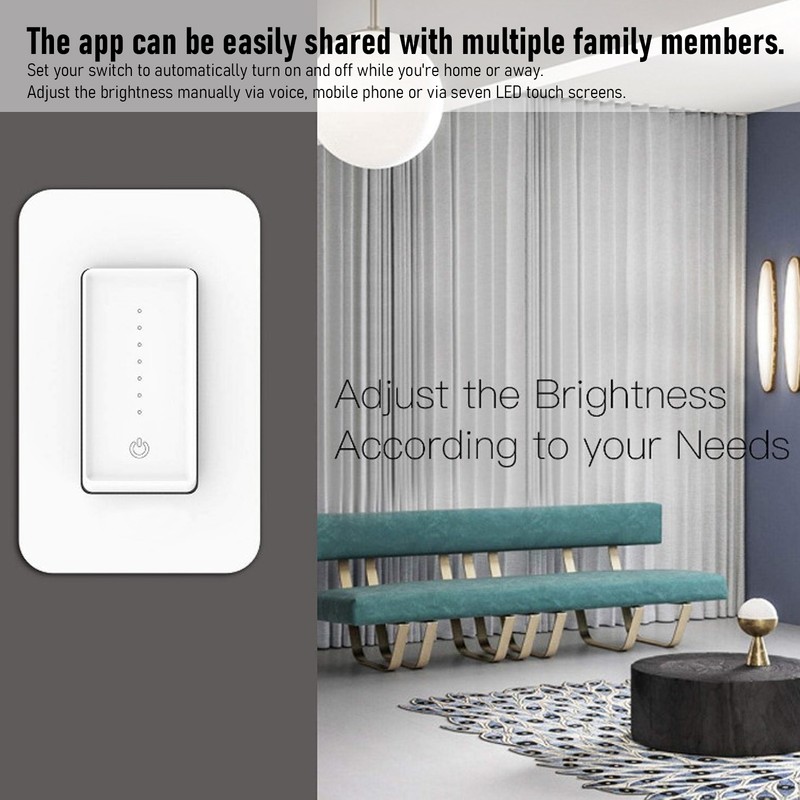 1、Dimmable, adjust the brightness manually through voice, mobile phone or through seven LED touch screens. 2、Control your lights using the app (for ios/android) anytime or anywhere. The app can be easily shared with multiple family members. 3、Set your switch to automatically turn on and off while you're home or away, it is more convenient yo operate. 4、You can even use the smart setting feature to sync lights to adjust with the sunset and sunrise / weather / temperature and even air quality. 5、Smart dimmer switch needs to be connected to the neutral white wire to work normally, 2.4G Wi‑Fi,suitable for any standard Multigang panel .