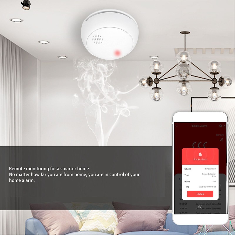 1、First Time Safety Alarm: When the detected smoke reaches the alarm threshold of the smoke alarm, the alarm will immediately sound a loud alarm and flash a red light. 2、Full Realization of Smart Living: Advanced technology and easy to use features make it ideal for protecting your home from the dangers of smoke. 3、Wide Monitoring Range: The detection range is up to 7.5 meters wide. However, if your corridor is longer than 15 meters, it is recommended to install more than one smoke alarm. 4、85dB Sound Alarm: It alerts you with a red indicator light and loud sound alarm when smoke concentrations are detected at dangerous levels. 5、Independent Smoke Alarm: Not only a smoke detector, but also an independent smoke alarm. Once smoke is detected at a dangerous level, you will be alerted at the first opportunity. 6、Low Battery Alarm: Alerts low battery detection and daily patrol, no need to worry about sudden power failure.