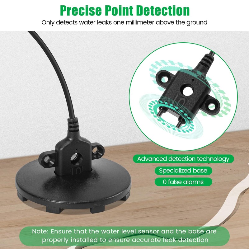 - ACCURATE LEAK DETECTION: We specially designed the disc base to raise the height of the sensor tip, ensuring that the sensor only detects water flow one millimeter above the ground, thereby reducing false alarms and ensuring that each alarm accurately reflects the actual leak situation