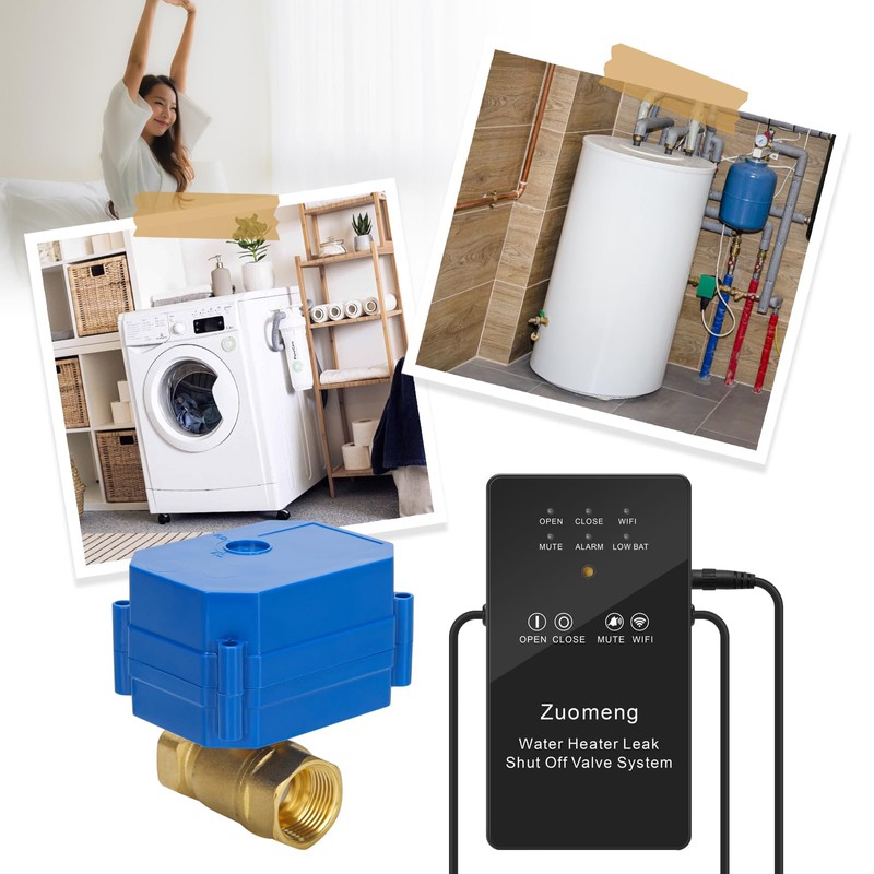 WiFi Water Leak Detector with Automatic Shutoff Valve,Zuomeng Smart Water Heater Remote Stop Valve with Leak Sensor, Water Leak Alert Push, 3/4"NPT 150PSI Brass Valve, Get Rid of Water Leakage