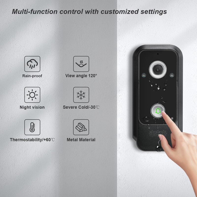 - Durable Design: The outdoor unit of the doorbell camera is made of aluminum alloy and ABS plastic, with waterproof and rainproof function, can work normally under extreme temperatures of -30 °C to 60 °C, and can adapt to various climatic conditions. And there are 6 types of doorbell ringing can be personalized control.