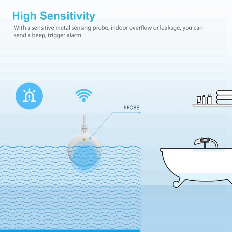 This wifi water flood sensor with a sensitive metal sensing probe, indoor overflow or leakage, you can send a beep, trigger alarm.Water damage is time sensitive - whether you're home or away, get instant text/email alerts when water is detected so you can act fast.It can help to protect your home and valuables from annoying leaks and dangerous floods, whether it's a dripping sink under the bathroom cabinet, a burst pipe in the basement, or a severe weather event.