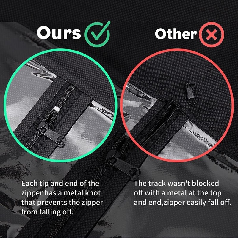 - Material: the bag is plastic and non-woven.The middle of the bag has a smooth and durable zipper, which makes it easy for you to access the wig.Stainless steel hooks are durable.Top grade plastic zipper.