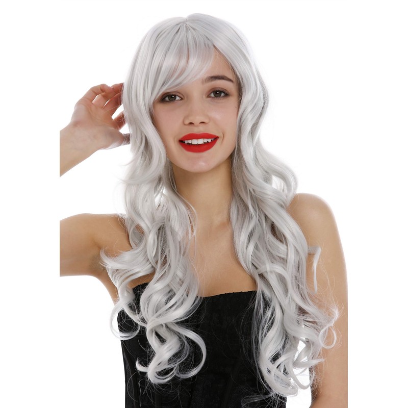 - Very long women's wig with light, very beautifully shaped curls. The wig has a long fringe that is worn parted. The model is available in many colours - here a light grey or silver grey.