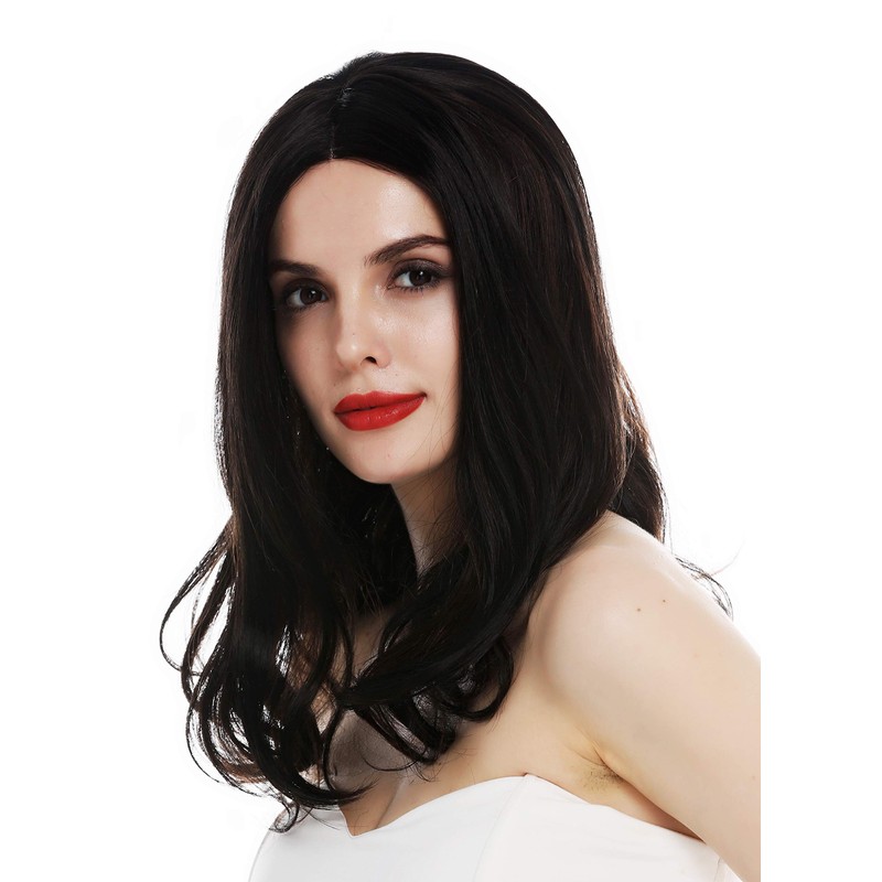 • Very natural looking women's wig – the long black hair is parted in the middle and has mahogany brown highlights running through. A small, partial monofilament is added under the parting to provide natural looking parting options.