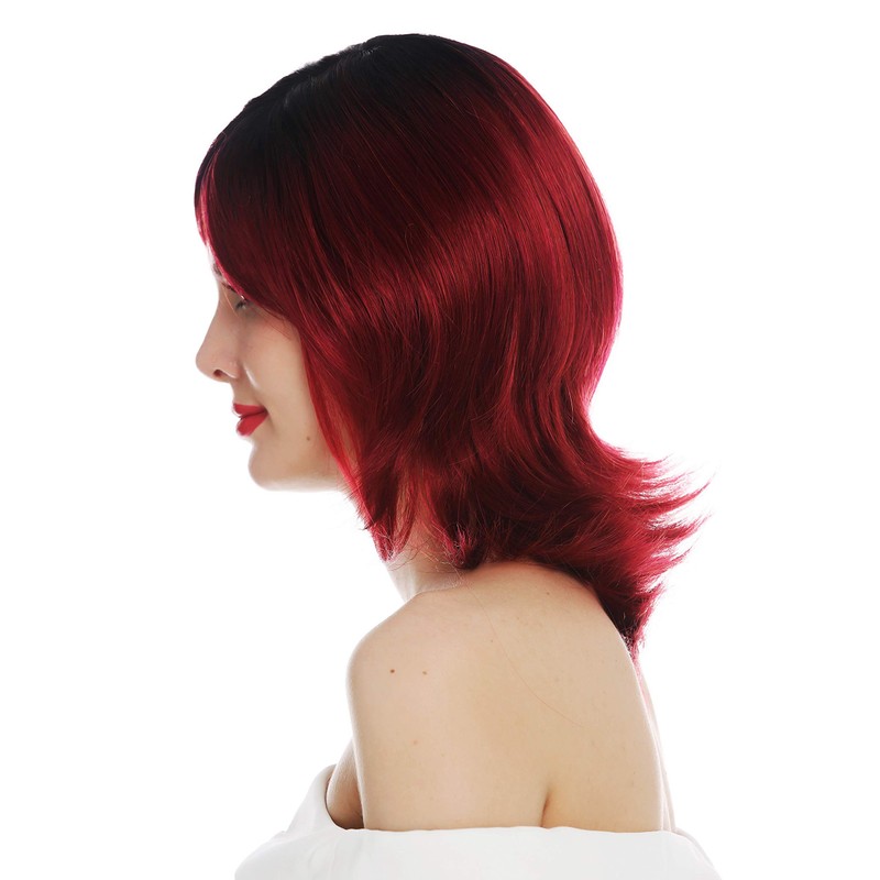 - High quality, partially hand made women's wig with shoulder long, layered, sleek hair and lively waves at the tips. The wig is dyed an ombre mix of a rich black at the hairline and signal red. A large, partial monofilament at the crown and under the parting reduces the weight and provides a comfortable wear. It also allows for more individual styling options.