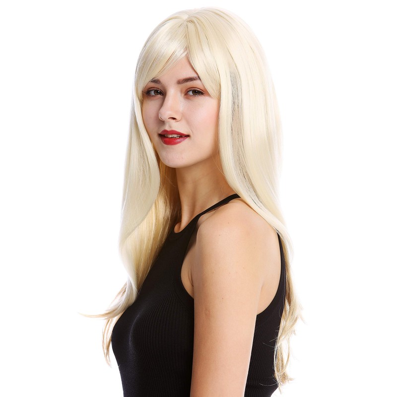 - Lady quality wig, long and straight hair, with a very sexy aura enhanced by a a nighty fringe and super bright blond mix.
