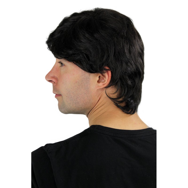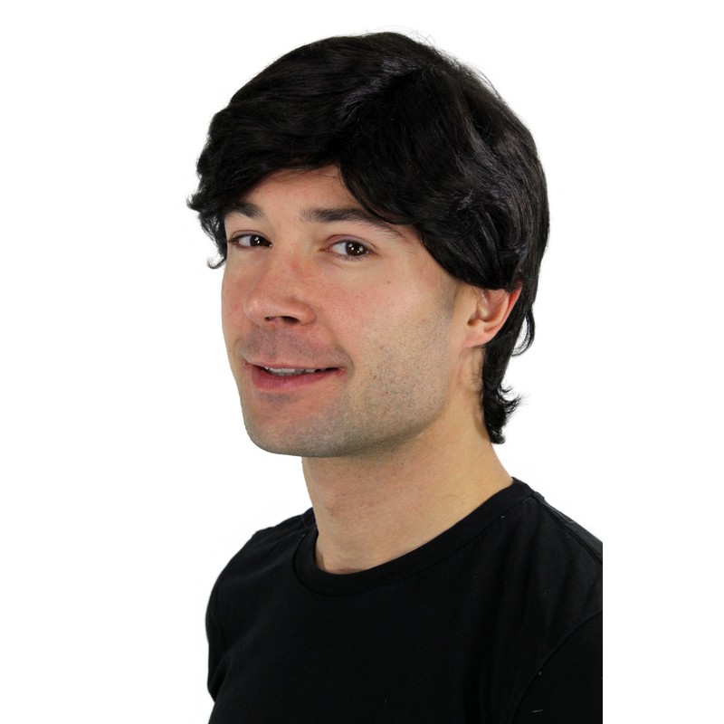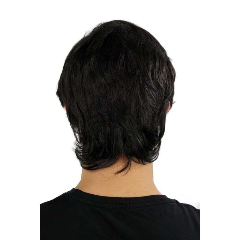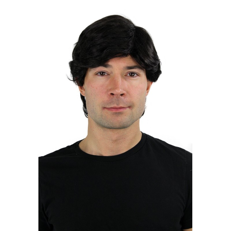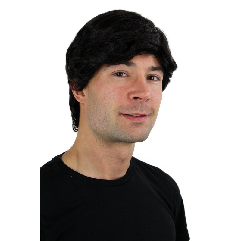 - Men's wig with short, straight, black hair and a side parting.