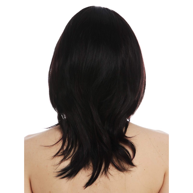 - Half length, shorter layered quality wig for women - thanks to slightly toupeed underhair, this smooth hairstyle has a great volume. The black hair is accentuated by aubergine-red highlights and lightened somewhat at a time.