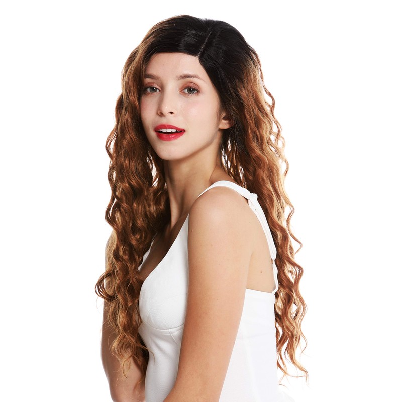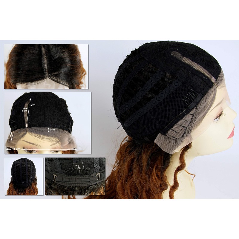 - Elaborately hand made women's wig with a partial monofilament at the parting and lace front allowing a very natural parting and hairline. The 25.5 inches long hair has luxurious curls, dyed an ombre and balayage mix – The black hairline fades into a mix of dark blonde and dark copper brown highlights.