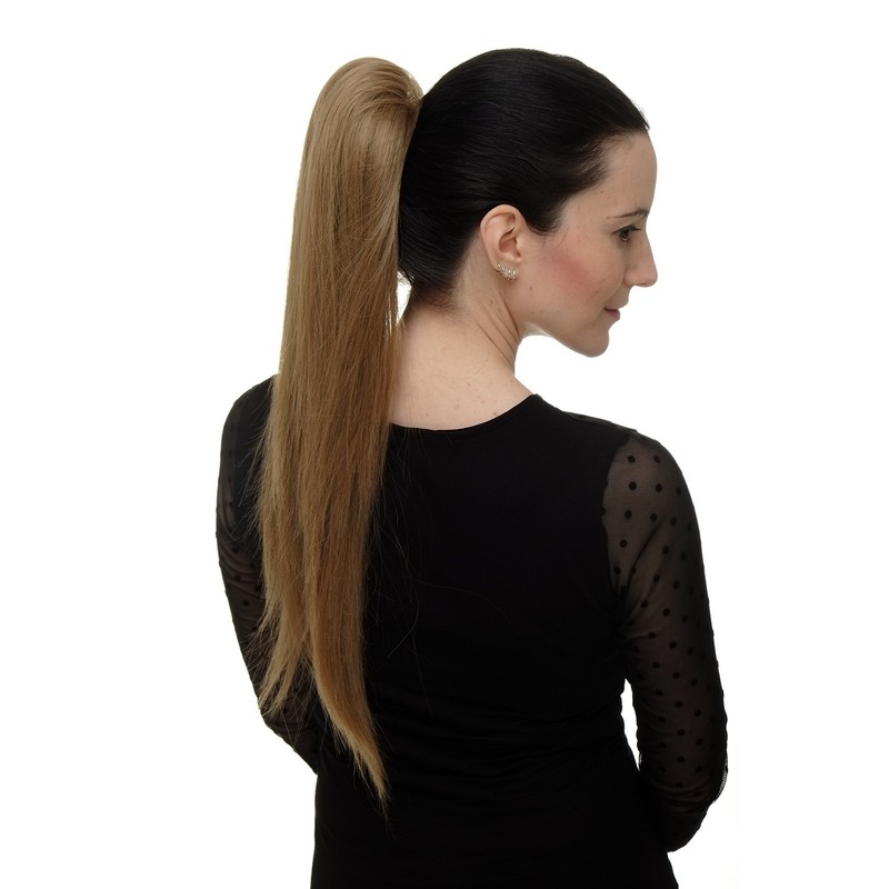 - Honey blonde, voluminous but smooth falling hairpiece made of high quality synthetic fibre, which is pulled onto your own hair together with a system of mini butterfly clip, comb and elastic pull.