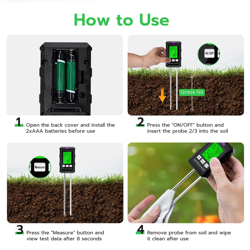 Easy Operation Just insert two AAA batteries, insert the probe into the ground 2/3 and press the on/off and test button. Within 10 seconds, you will receive an accurate measurement. Clean the probe after each use to maintain its sensitivity and ensure a long service life.