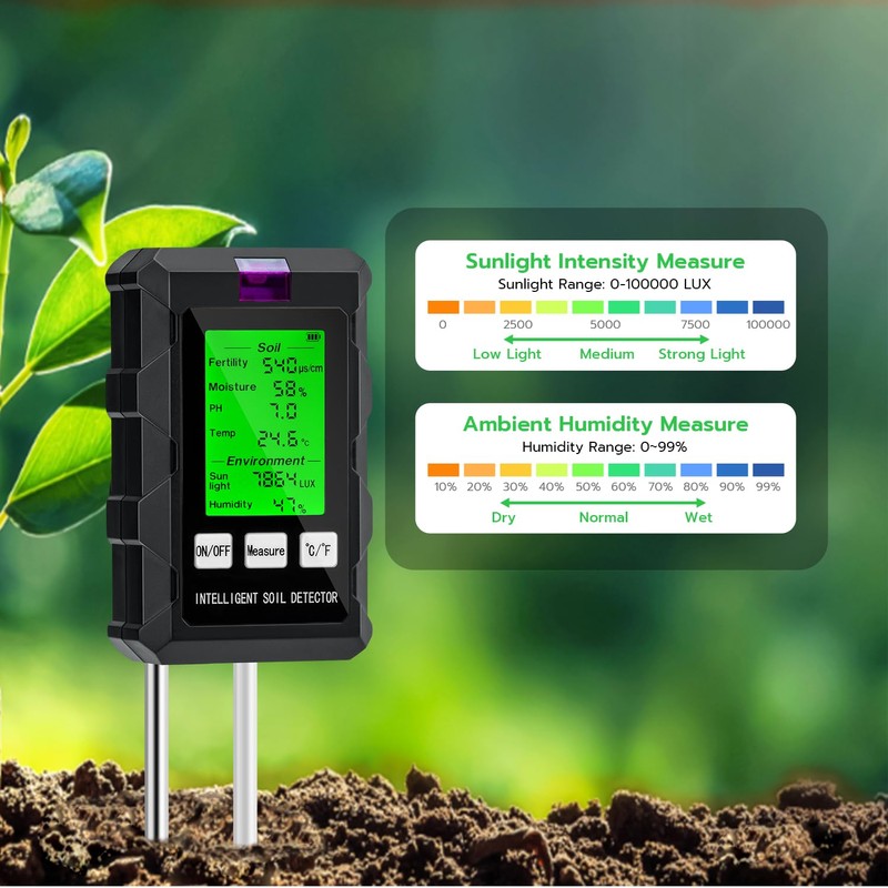 - 6 in 1 Multifunctional Soil Tester This comprehensive tool helps you monitor six essential factors for plant growth: soil moisture, pH, temperature, fertility, light intensity and humidity. It delivers real-time and accurate data, making it an essential tool for gardeners or farmers.